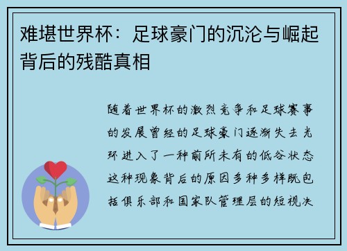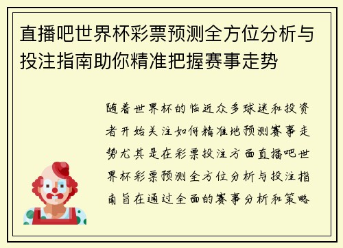 文章摘要:《钱坑世界杯:背后的资金博弈与足球产业的暗潮涌动》深入剖析了世界杯背后复杂的资本运作和足球产业的全球化趋势。从资金链的巨大变动到广告赞助的影响,再到足球俱乐部和球员交易的市场化,各种资金博弈在世界杯这一全球最大体育盛事中交织成网。本篇文章通过四个角度展开探讨,分析世界杯赛事如何成为世界各大资本的争夺焦点,并揭示背后隐藏的产业链条。文章将引用全球顶尖大学的研究成果,结合具体的市场数据,为读...